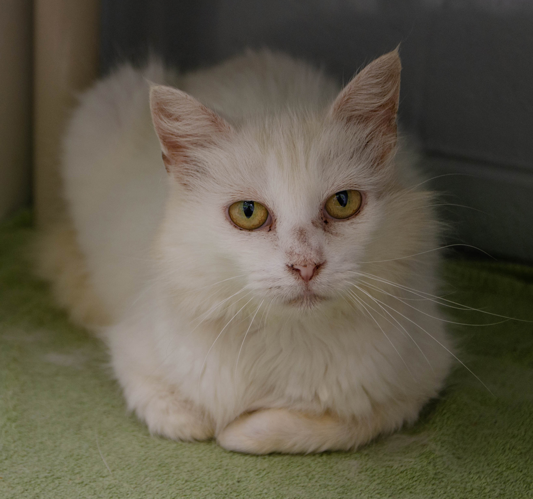 DaniAre you looking for a feline companion who’s well past that exuberant kitten stage of life? If so, Dani might be just who you need. This sweet lady is about 8 years old, so she’s quite settled in her ways, content to curl up in a favorite spot and enjoy a long, well-deserved nap. She likes attention, but she doesn’t beg for it and seems happy just to be in her own space. Dani has a medium-length white coat with little touches of grey here and there and big, golden-yellow eyes. All she wants in the world is a safe, comfortable home where she can be herself.